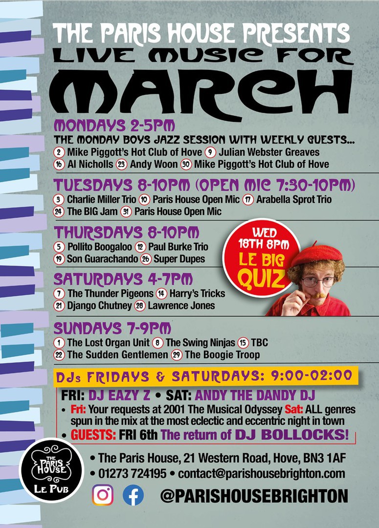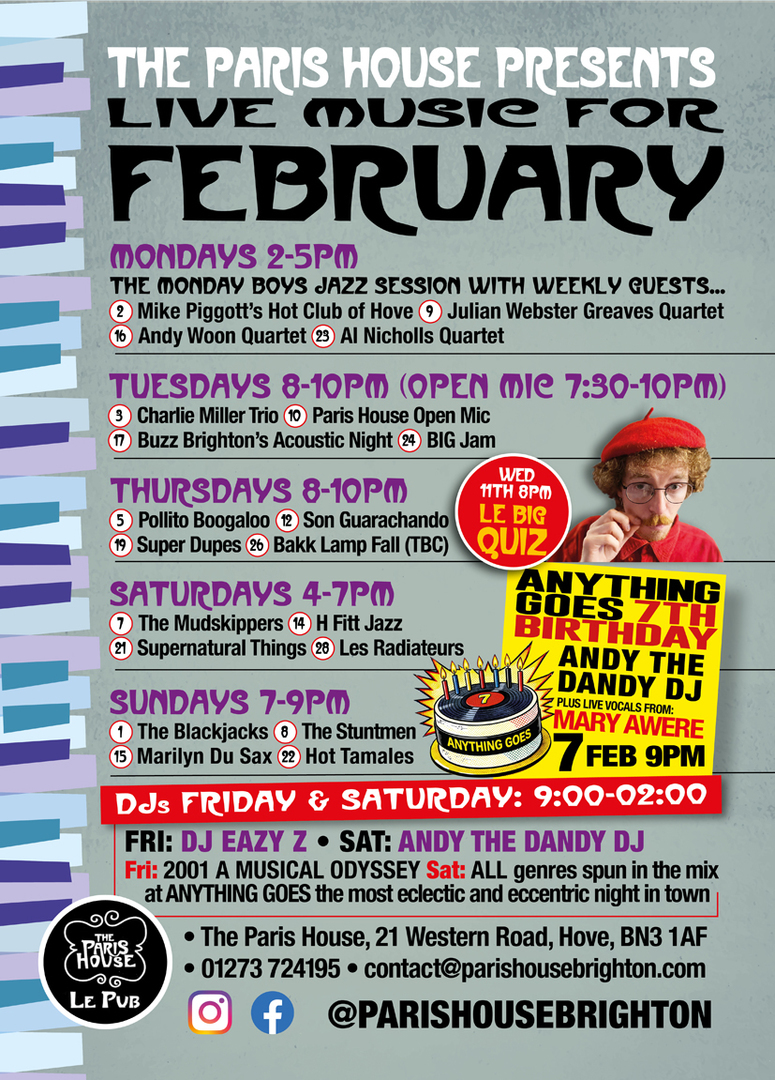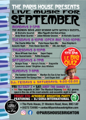 The Paris House is a French-styled cafe-bar on the Brighton-Hove border with live music at it's very core.